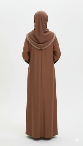 Elegant chocolate brown abaya crafted from soft flowing fabric, beautifully detailed with golden embroidered patterns across the front and sleeves for a luxurious finish. Designed with a relaxed straight cut for comfort and grace, this abaya comes with a coordinating hijab to complete the look. Perfect for occasions, gatherings, or elegant everyday wear.