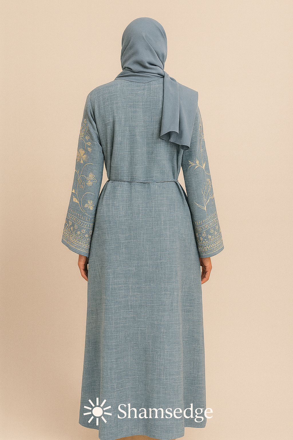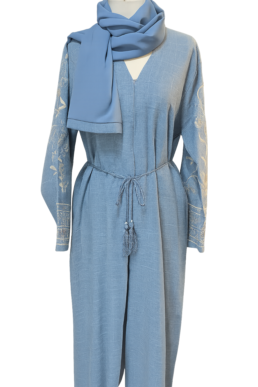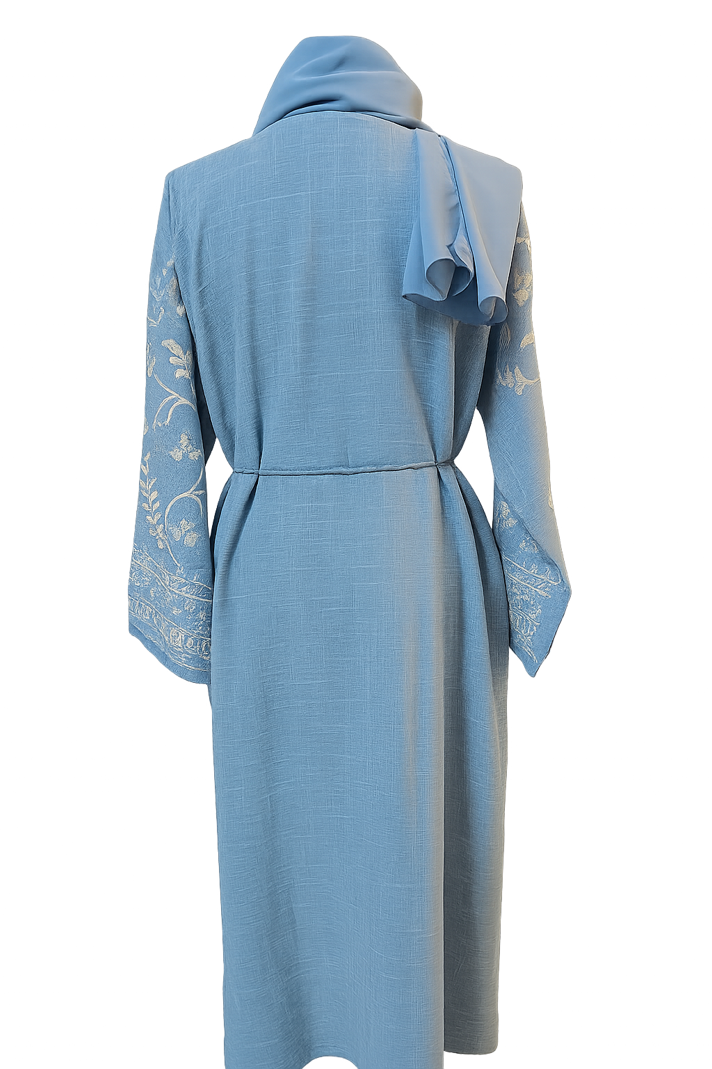 Elegant dusty blue abaya with delicate floral embroidery along the sleeves and a soft matching belt. Made from lightweight linen-blend fabric, it offers breathability and sophistication for any occasion. Paired with a matching scarf to complete the refined look.