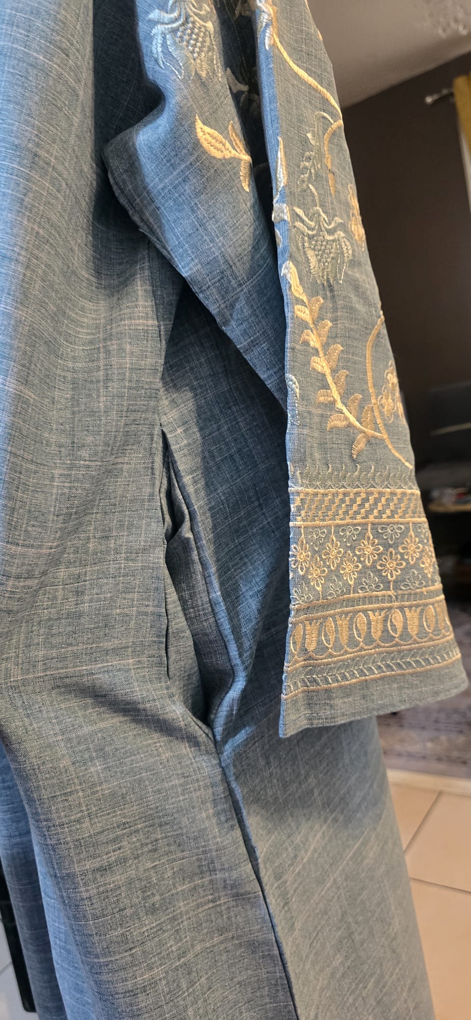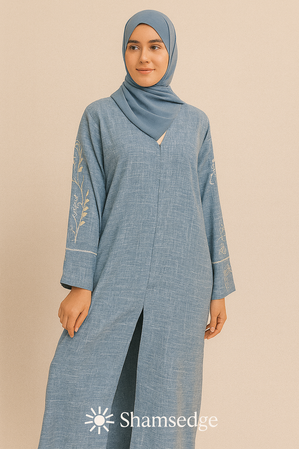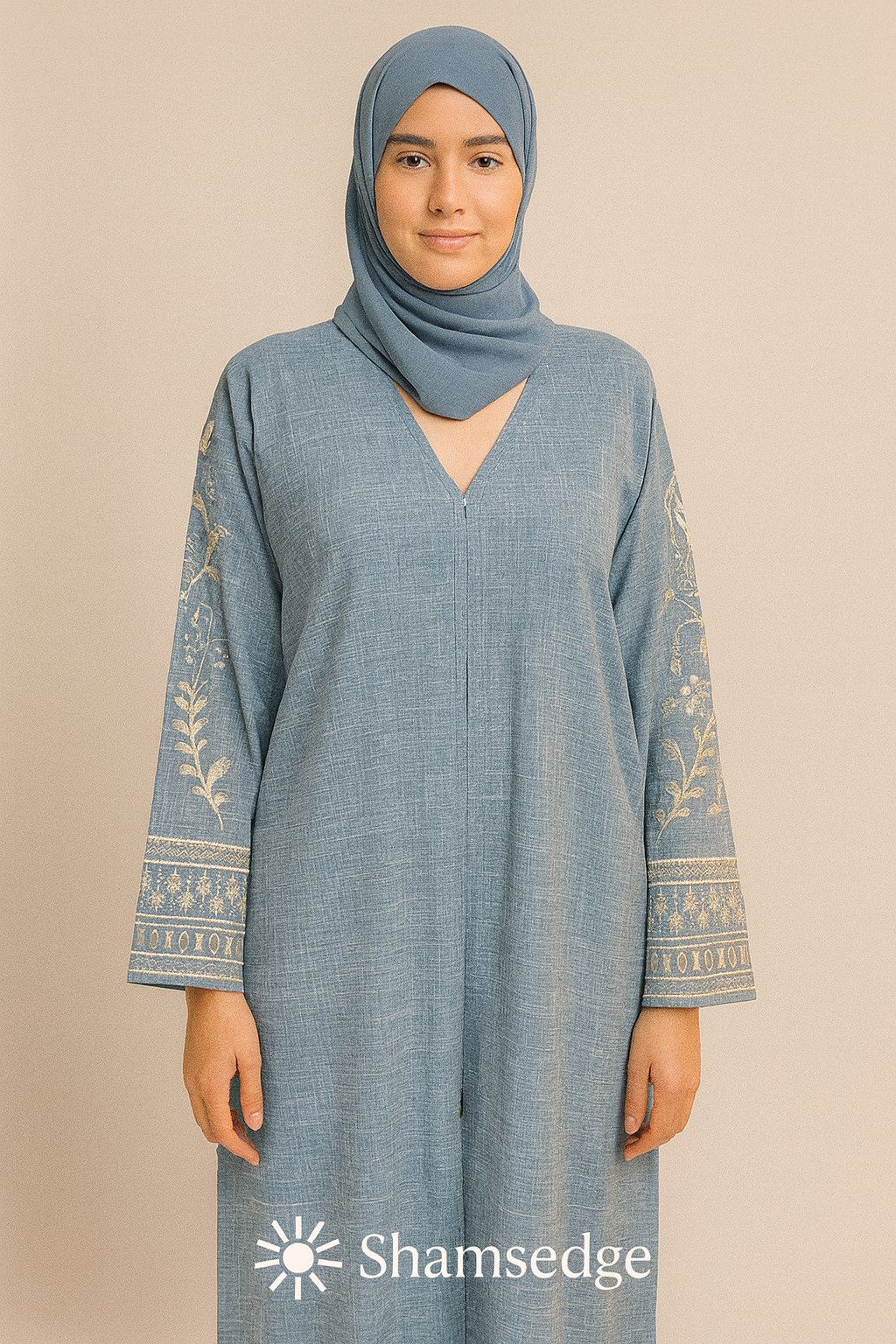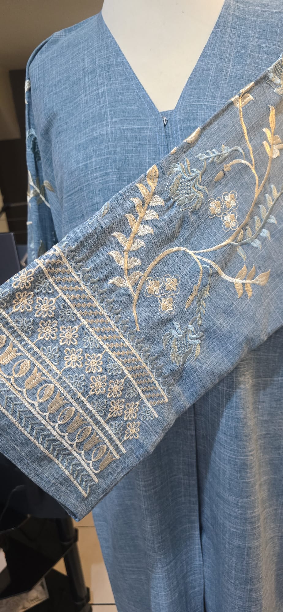 Elegant dusty blue abaya with delicate floral embroidery along the sleeves and a soft matching belt. Made from lightweight linen-blend fabric, it offers breathability and sophistication for any occasion. Paired with a matching scarf to complete the refined look.