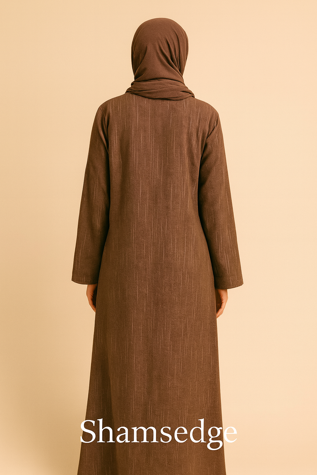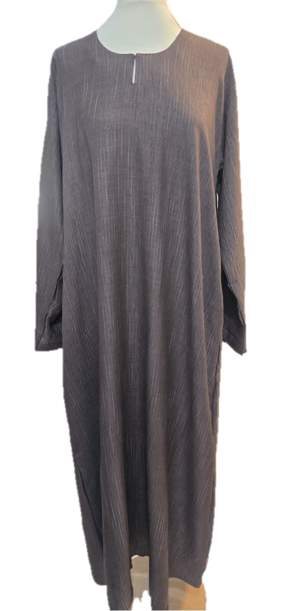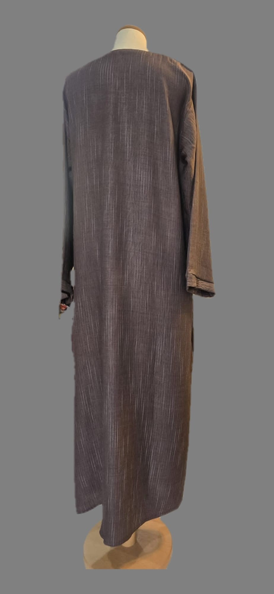 A contemporary charcoal-grey abaya featuring soft vertical texture lines for a refined, elongated silhouette. The subtle slit neckline adds a minimalist touch, perfect for everyday wear or casual gatherings. Lightweight and breathable for year-round comfort.