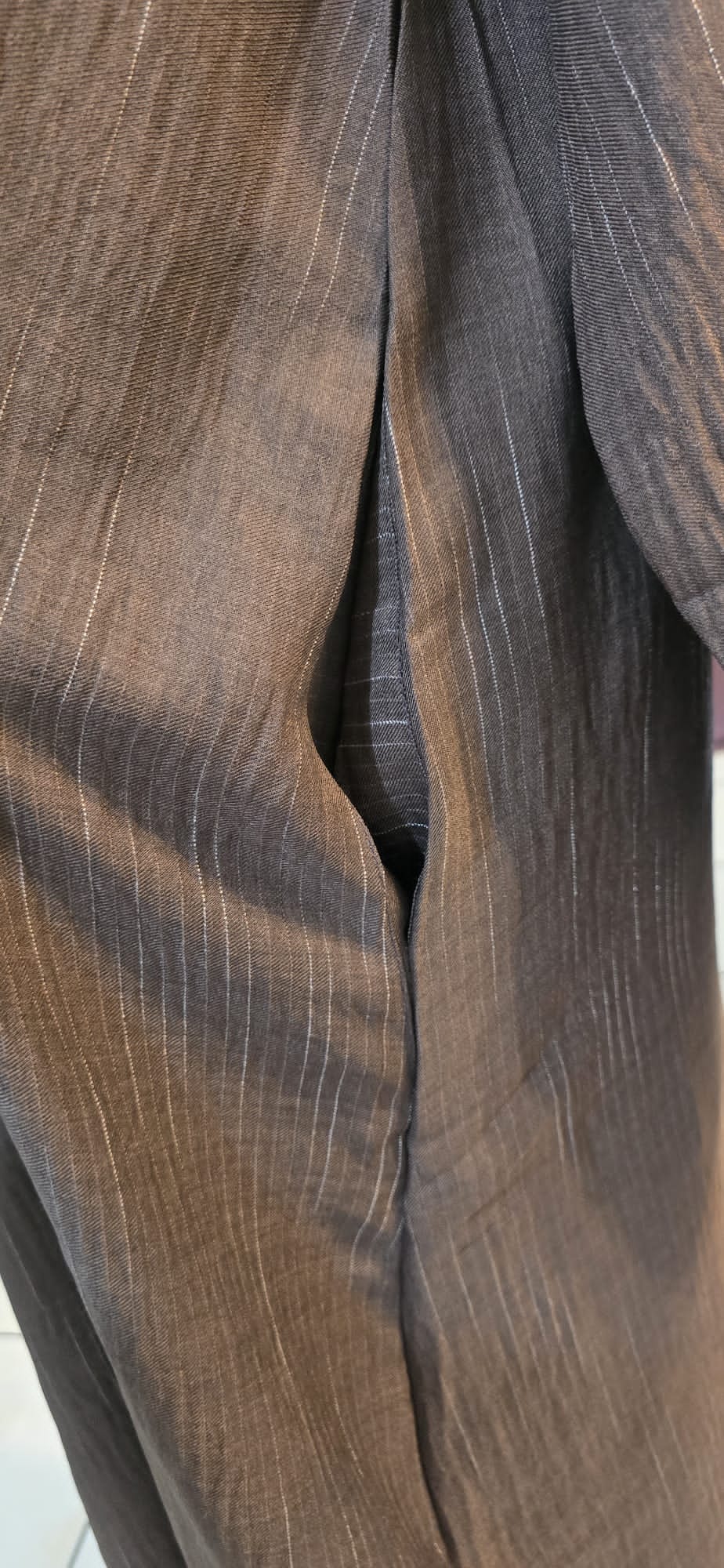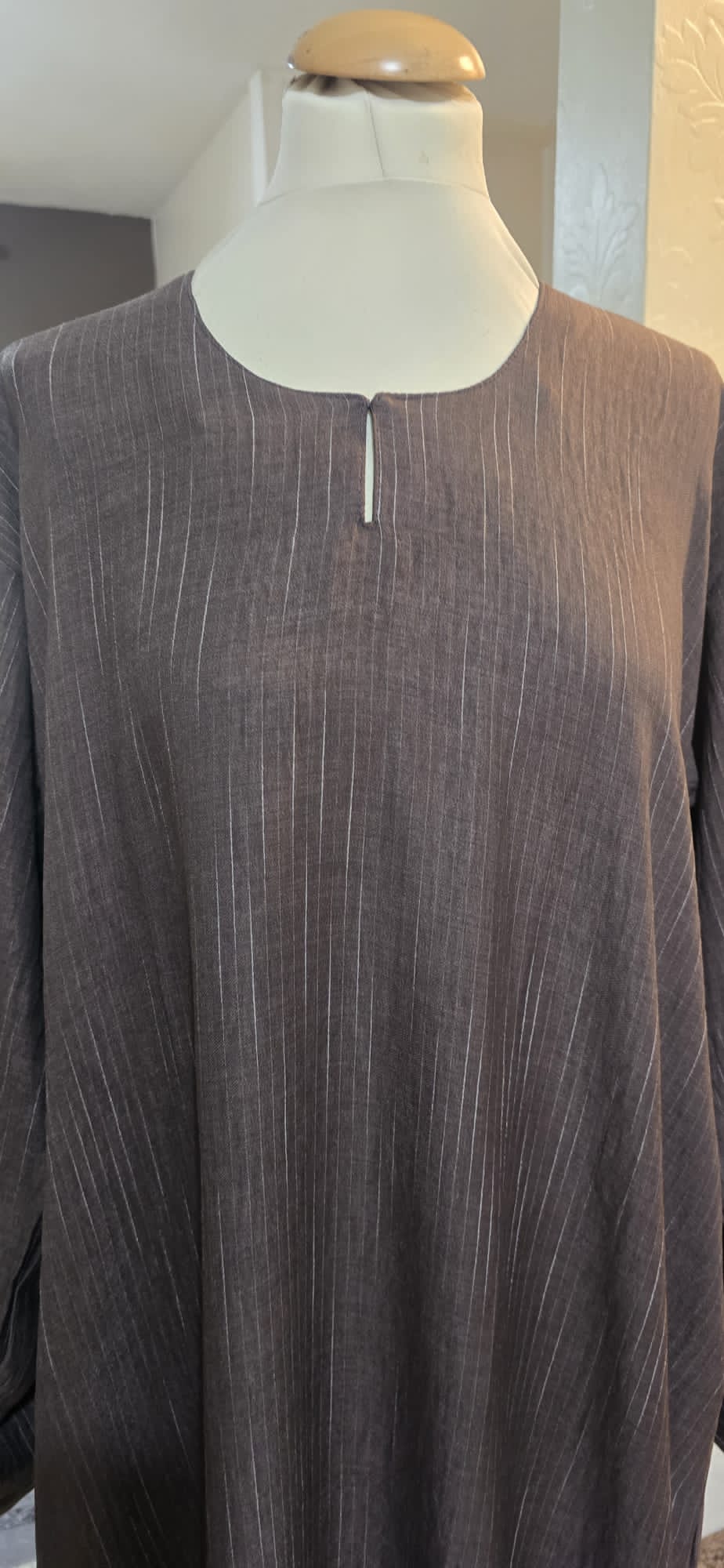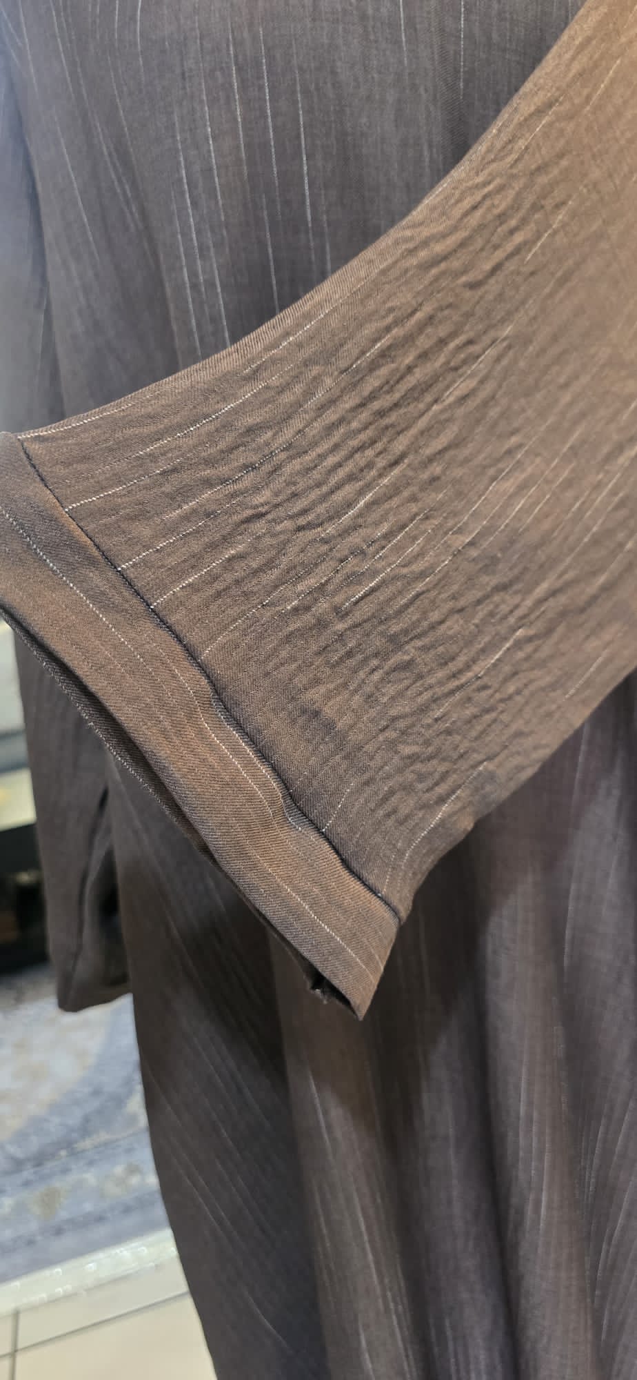 A contemporary charcoal-grey abaya featuring soft vertical texture lines for a refined, elongated silhouette. The subtle slit neckline adds a minimalist touch, perfect for everyday wear or casual gatherings. Lightweight and breathable for year-round comfort.