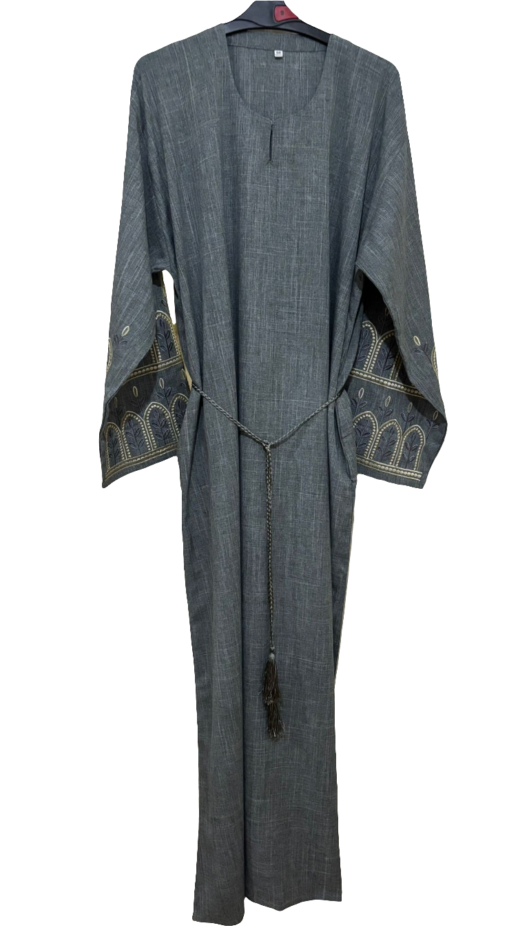 An elegant charcoal-grey abaya designed from textured fabric, highlighted with exquisite geometric embroidery on the wide cuffs for a distinguished look. The straight, flowy silhouette ensures comfort and modesty, while the set is perfectly completed with a matching tassel belt and coordinating hijab for a polished, ready-to-wear ensemble.