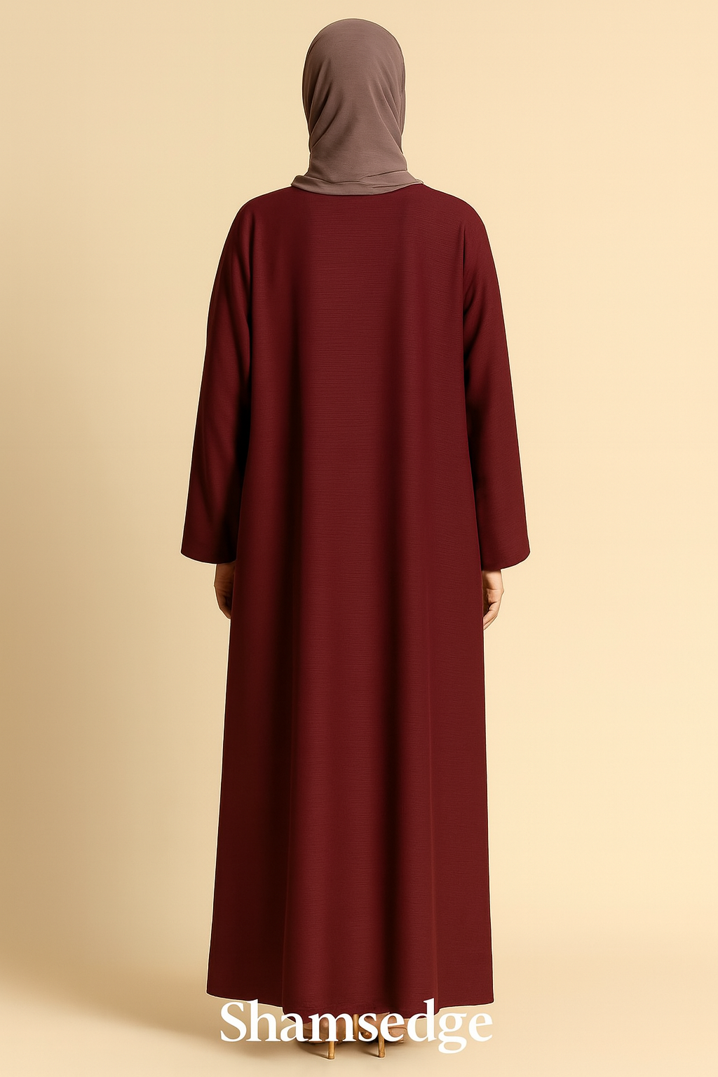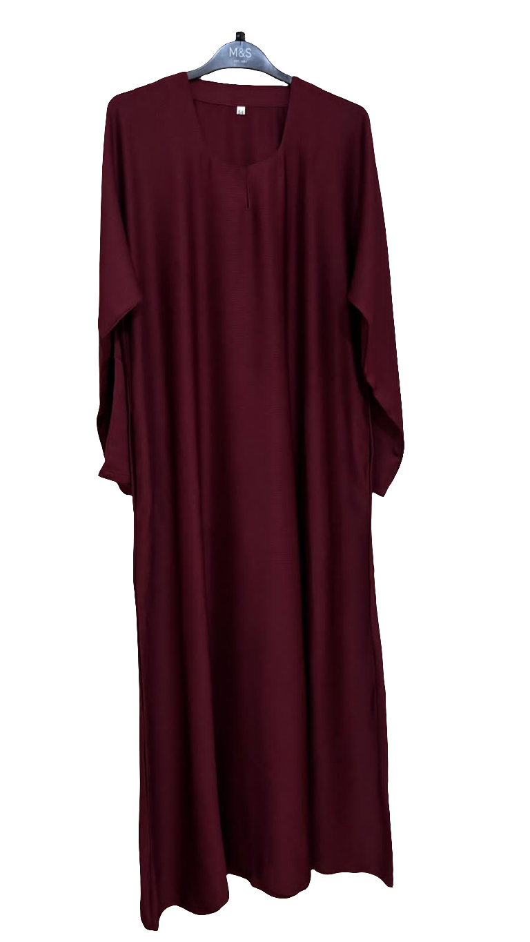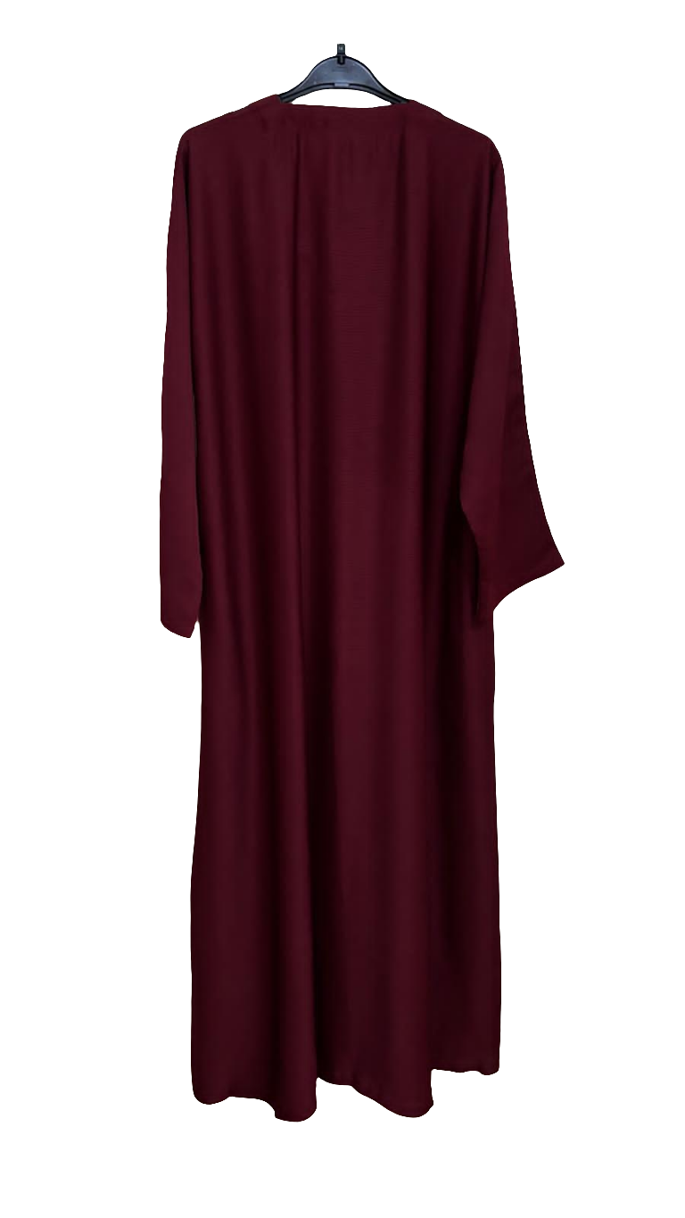 A timeless maroon abaya crafted from soft, flowing fabric for effortless elegance. Designed with a simple straight cut and minimal detailing, it offers both comfort and versatility. Perfect for layering with your favorite accessories or wearing as a refined everyday piece.