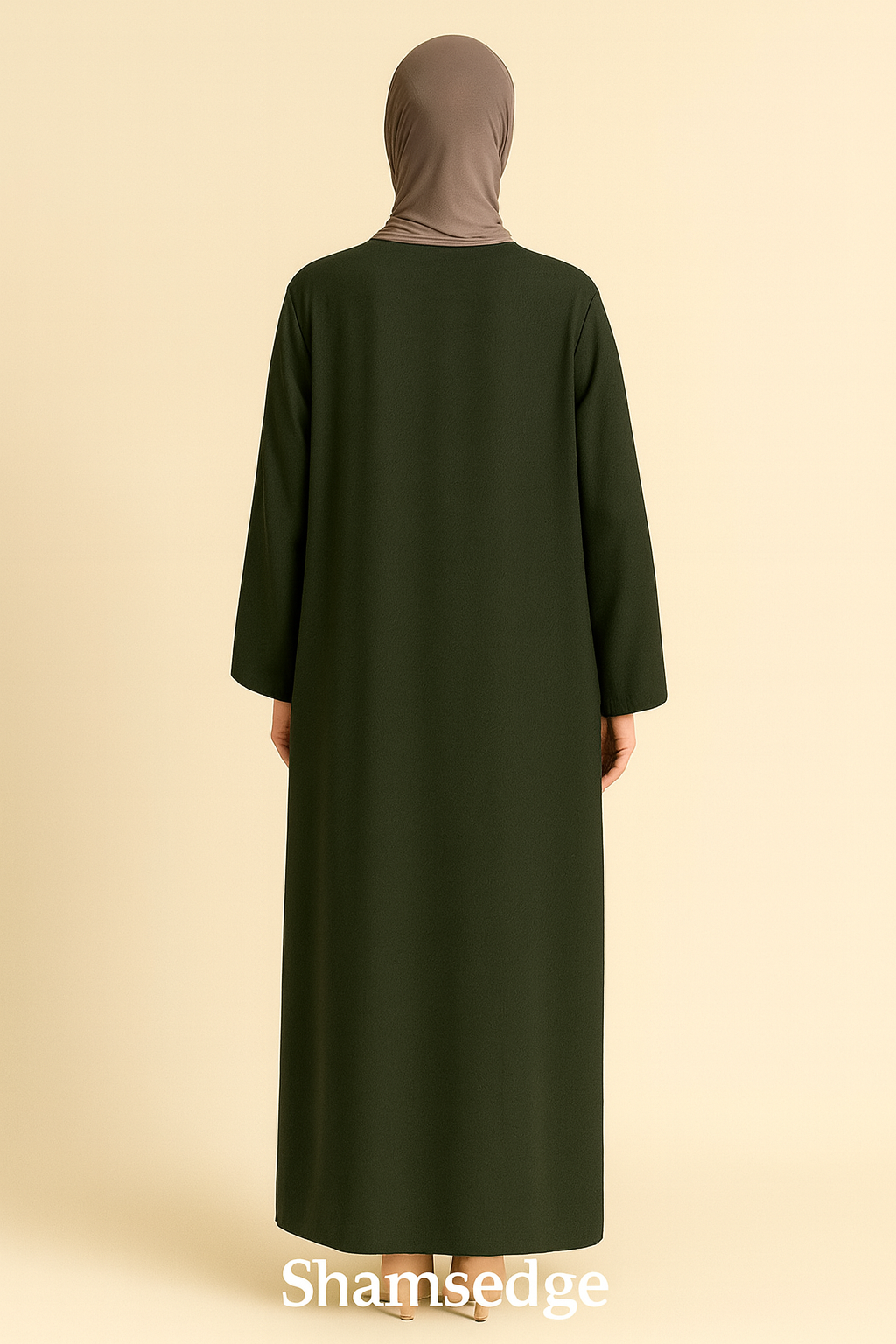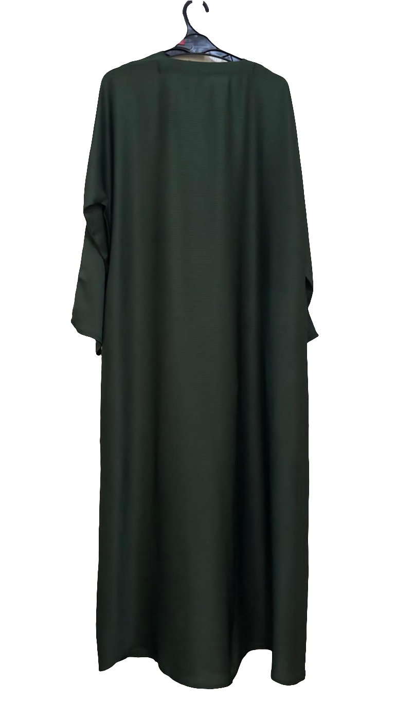 A graceful abaya in a deep forest green shade, tailored from soft, breathable fabric for an elegant drape. Its minimalistic straight-cut design ensures effortless modesty and comfort, making it a versatile piece for both daily wear and special occasions.