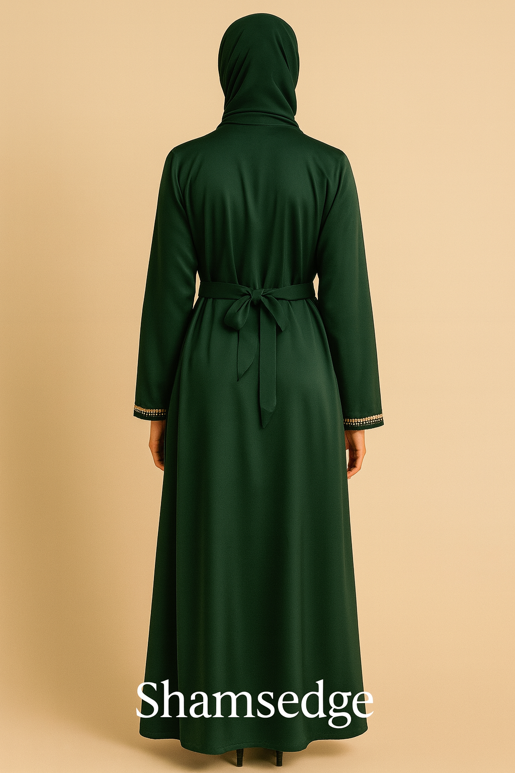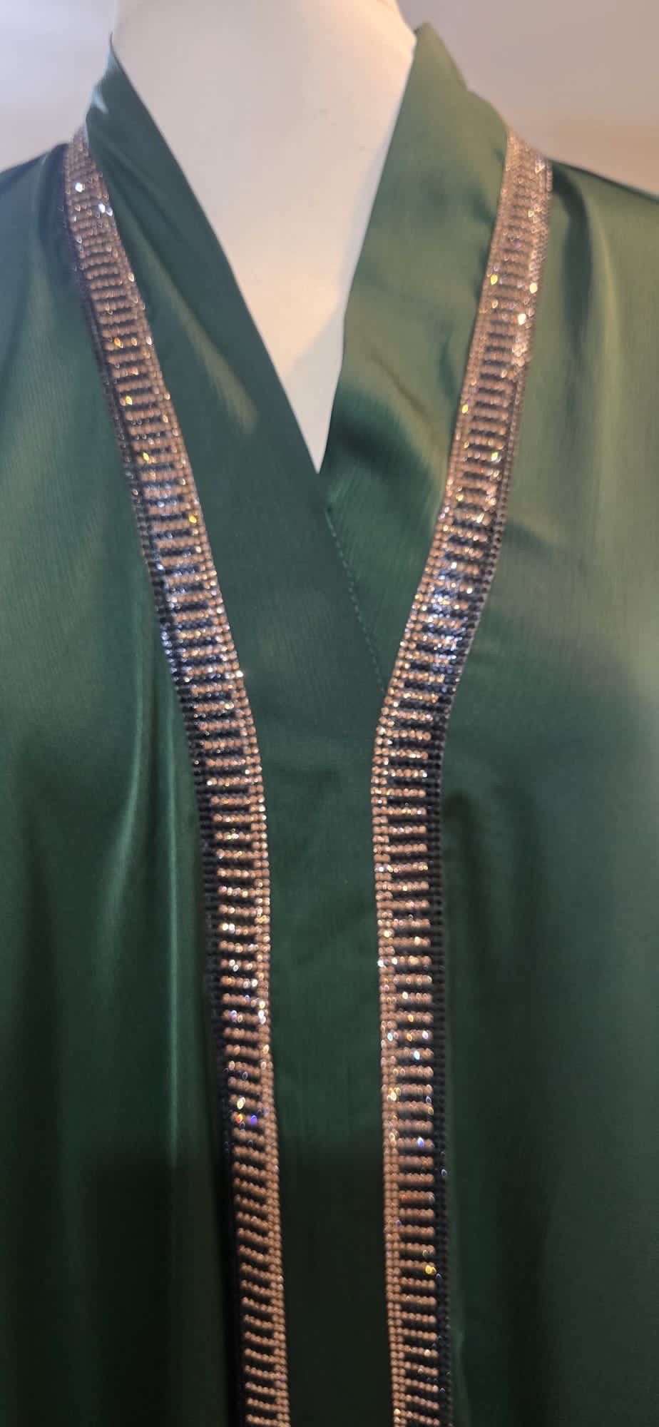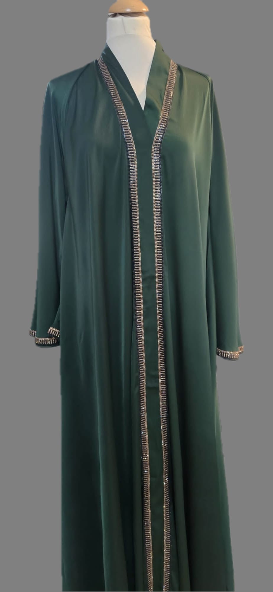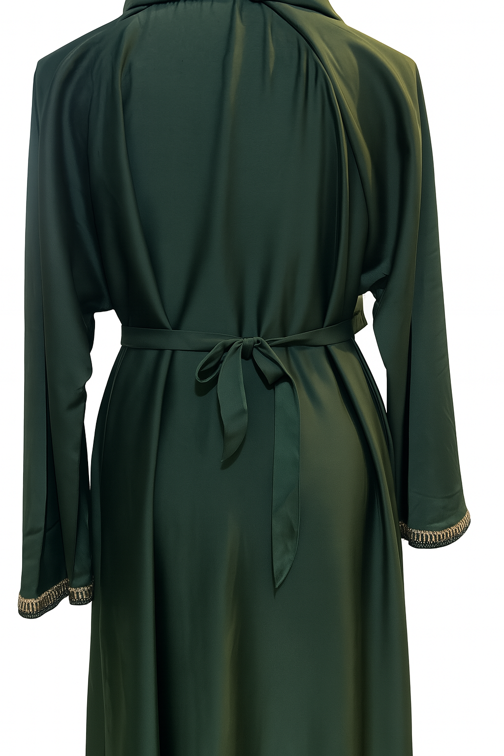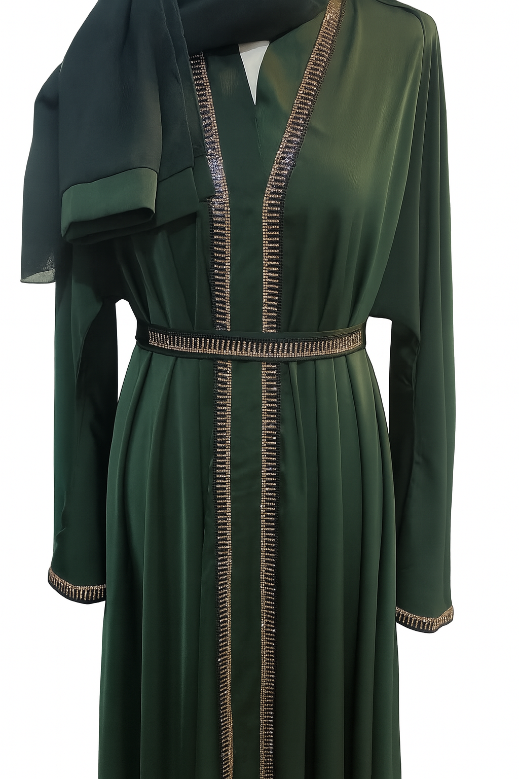 stunning emerald green abaya adorned with shimmering gold trim along the front, sleeves, and belt.