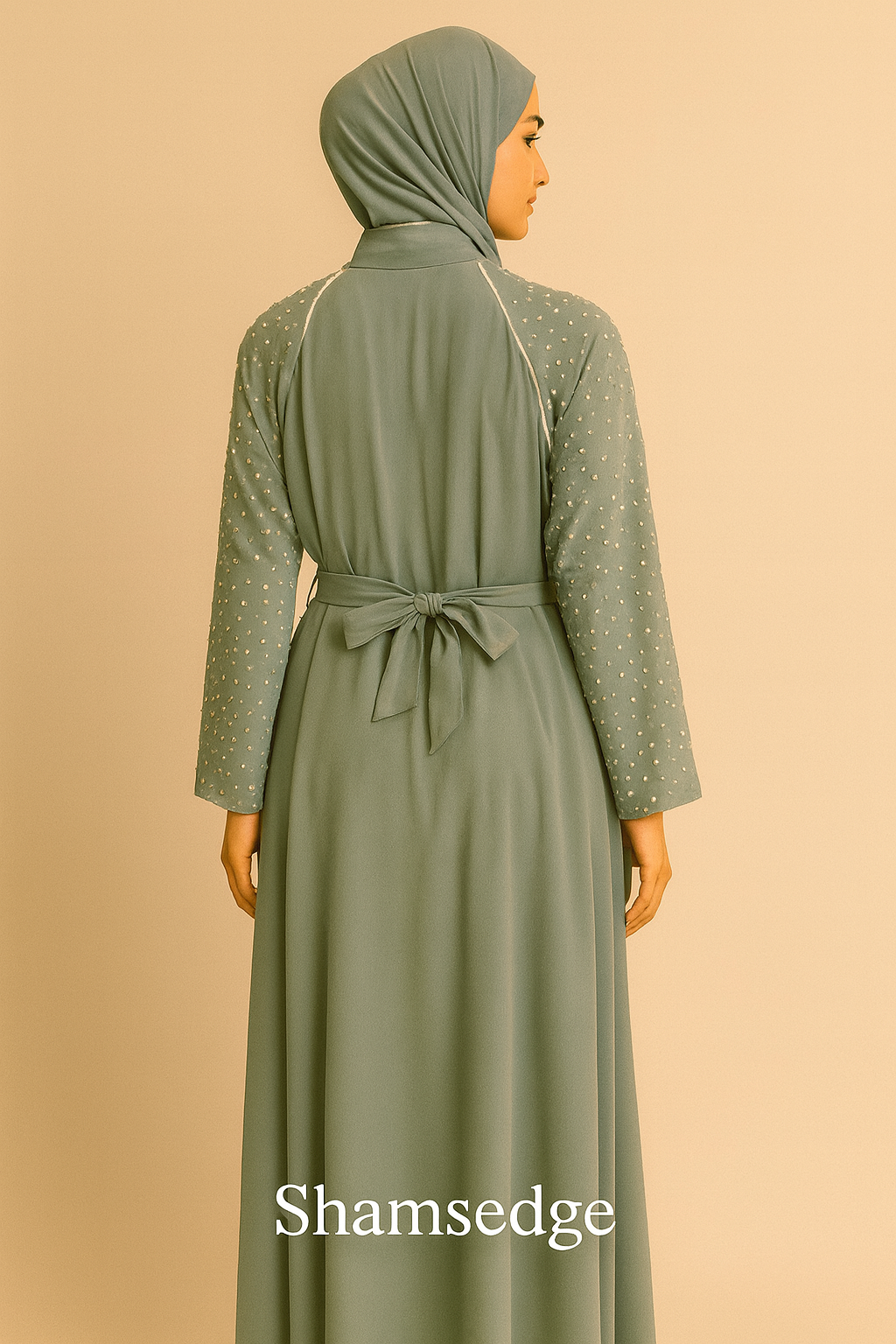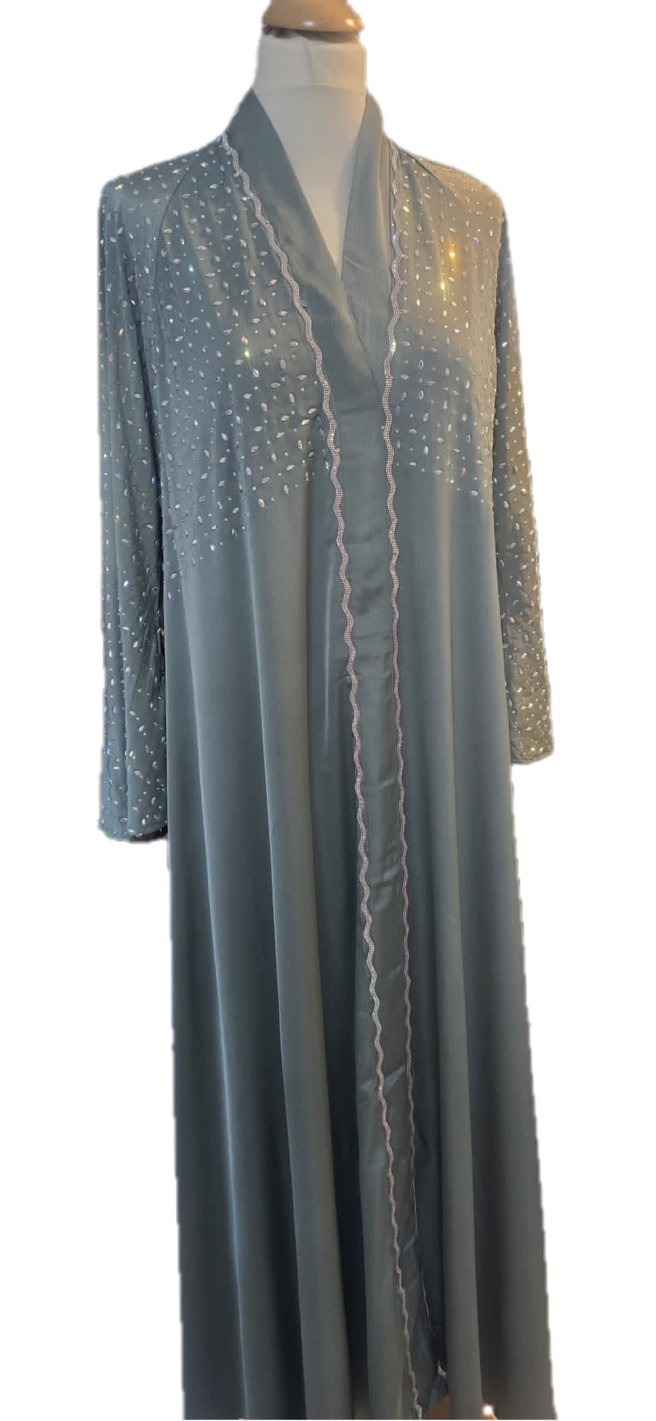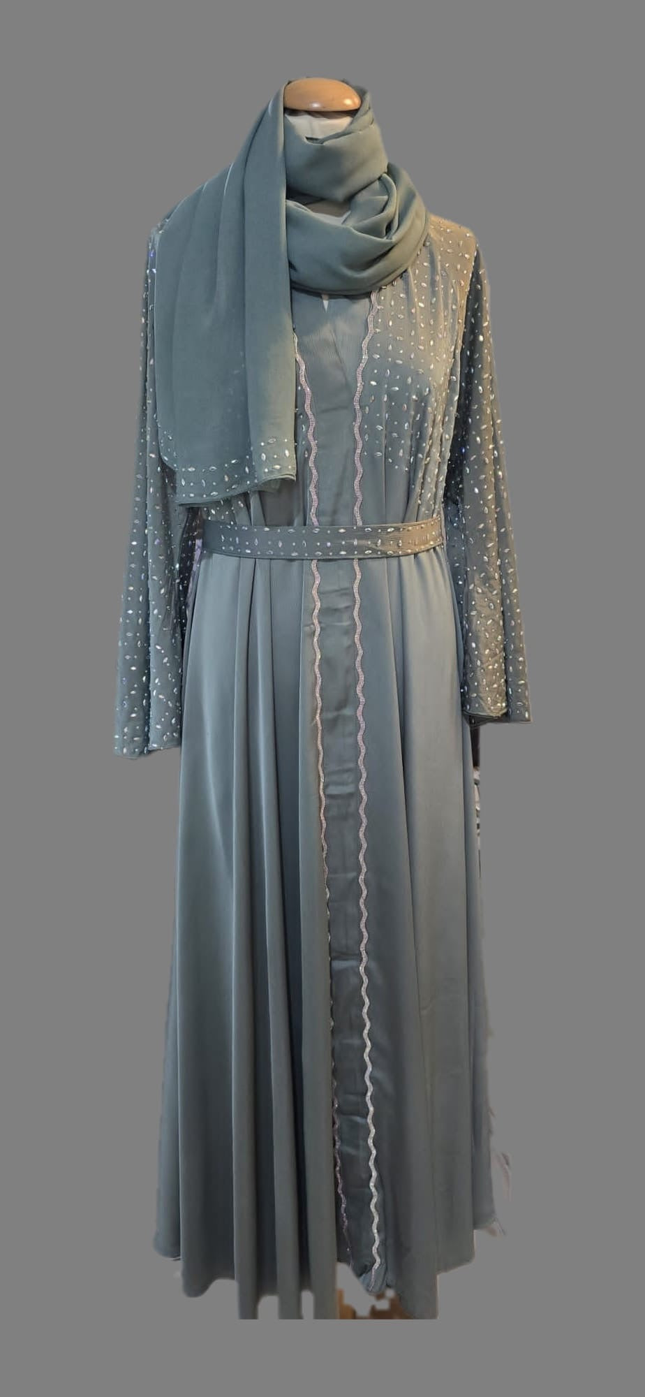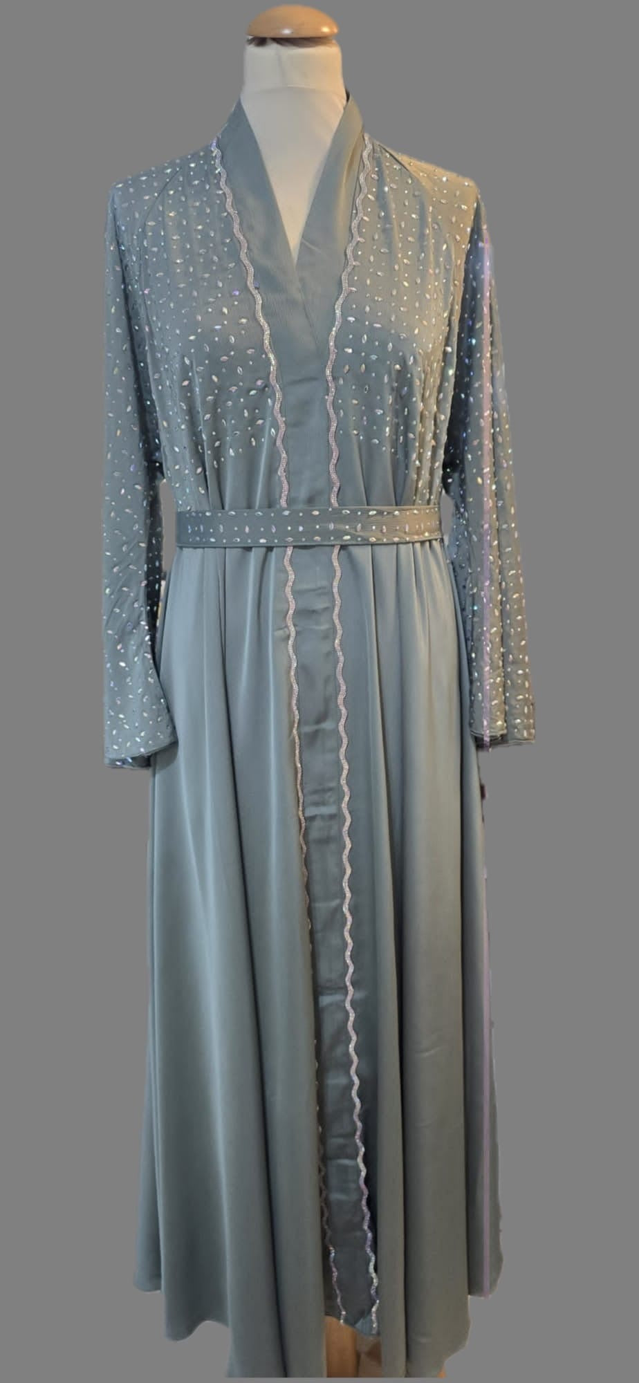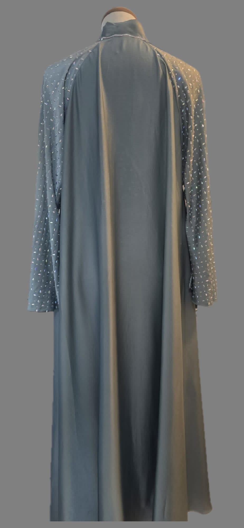 An elegant dusty blue abaya featuring delicate pearl-like embellishments along the sleeves and upper bodice.
