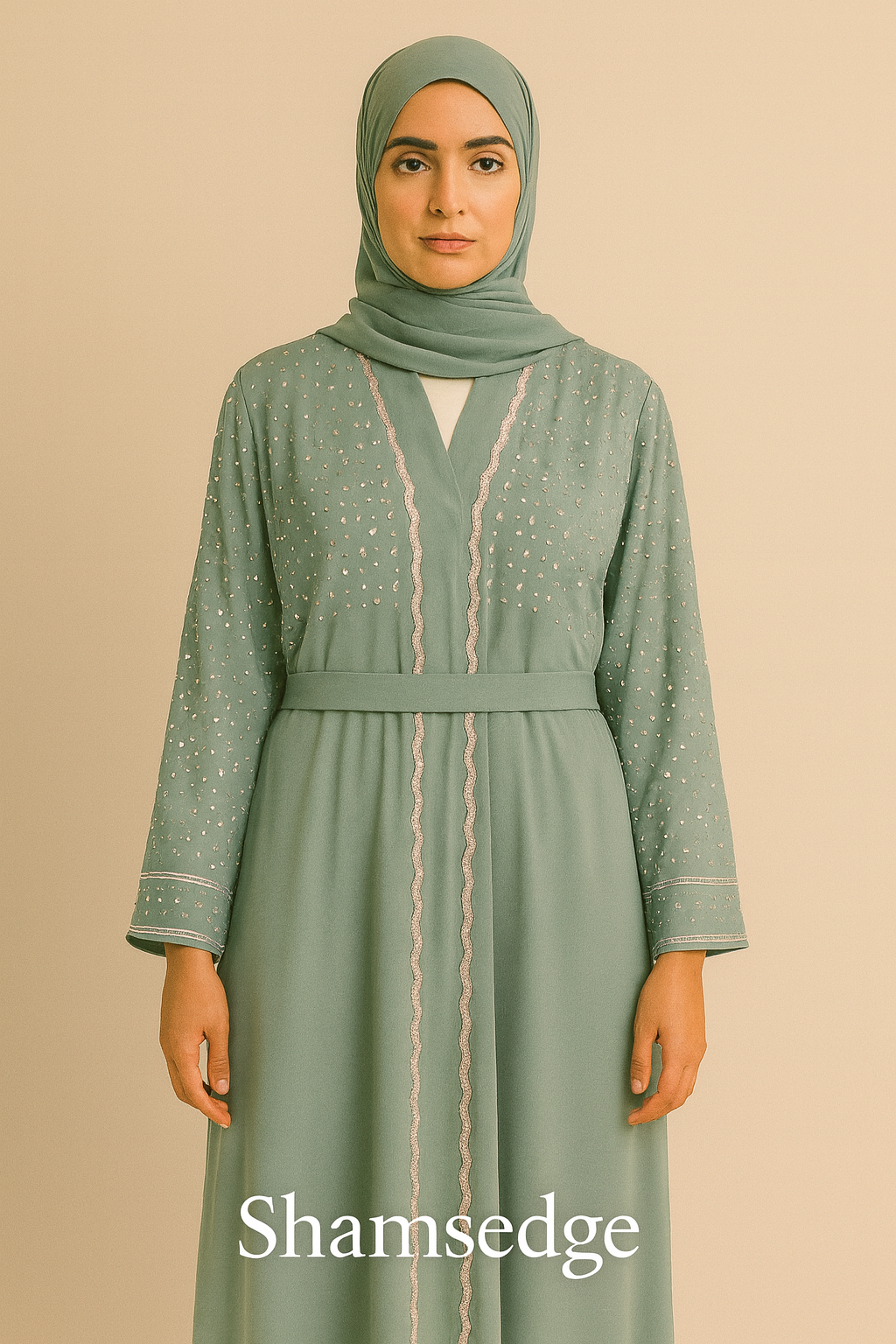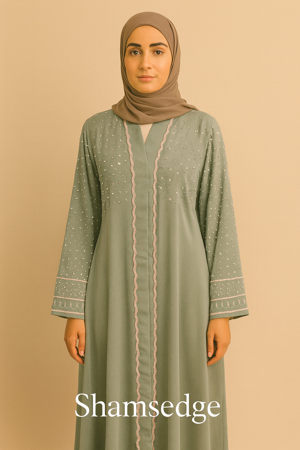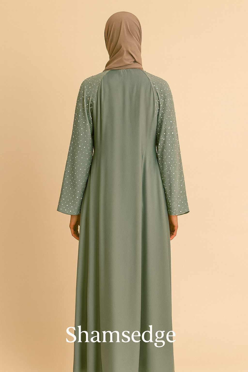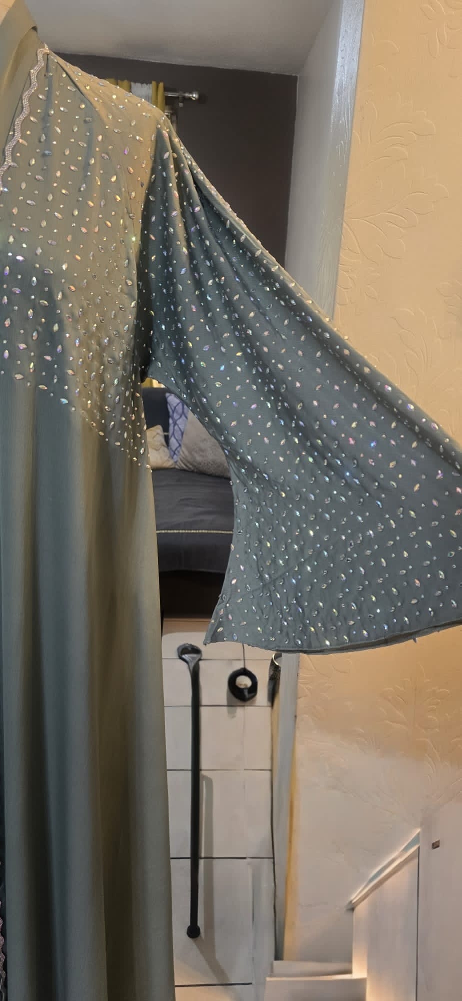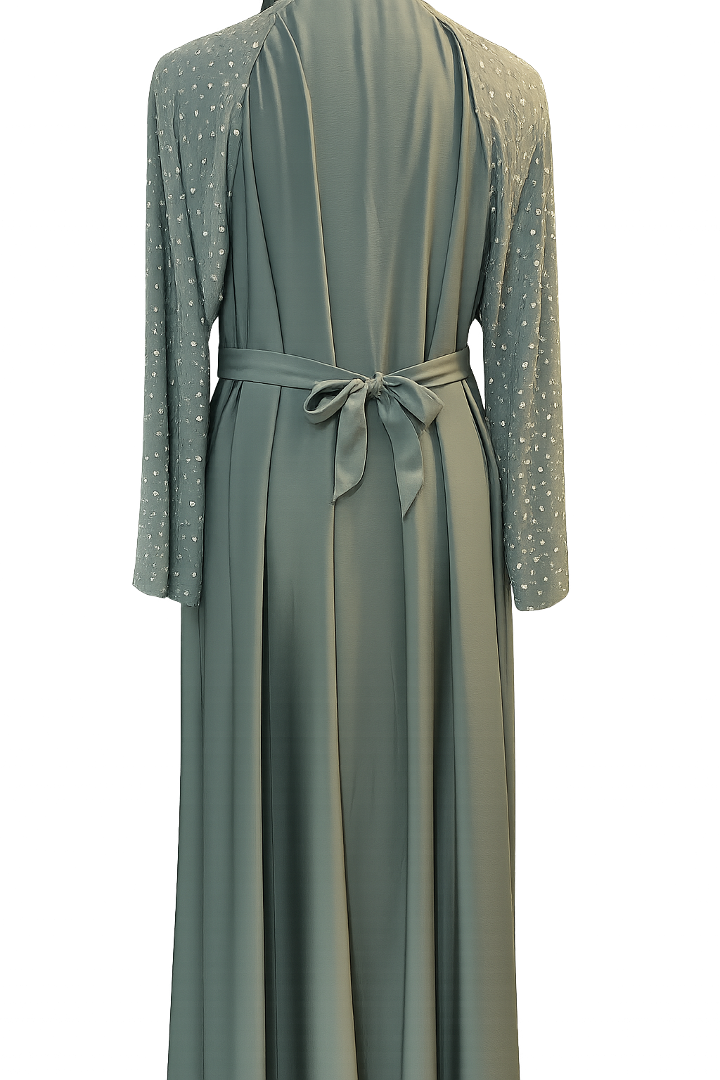 An elegant dusty blue abaya featuring delicate pearl-like embellishments along the sleeves and upper bodice.