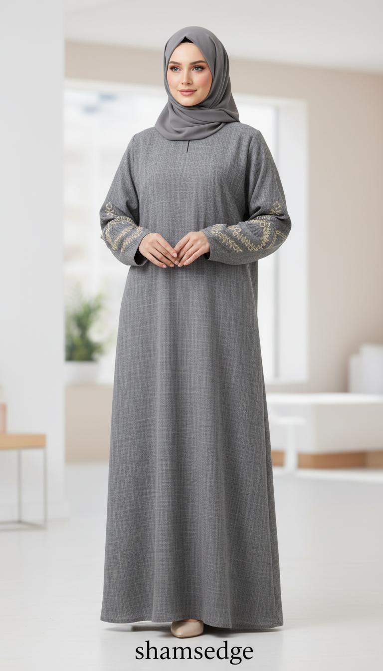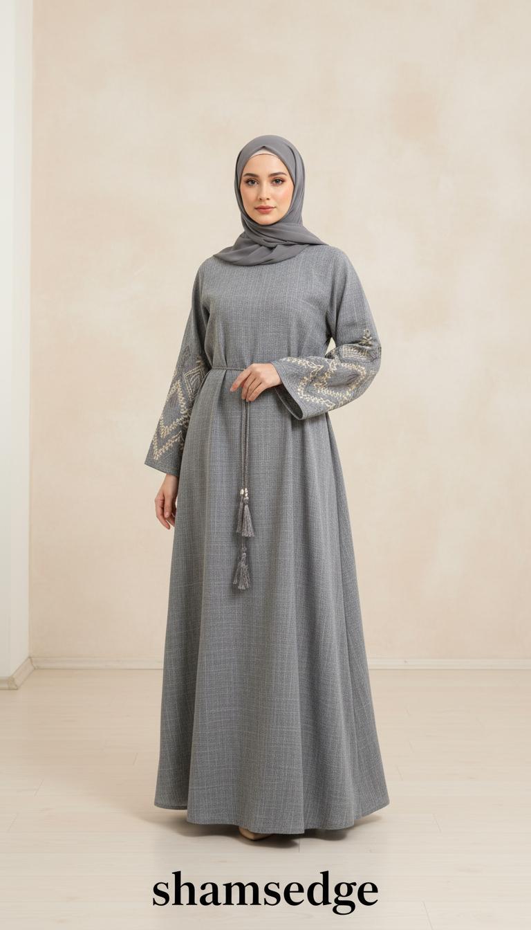 Chic grey abaya crafted with subtle check-textured fabric and finished with striking geometric embroidery on the sleeves. The flowy cut and matching tassel belt add elegance and comfort, making it perfect for casual sophistication or evening gatherings.