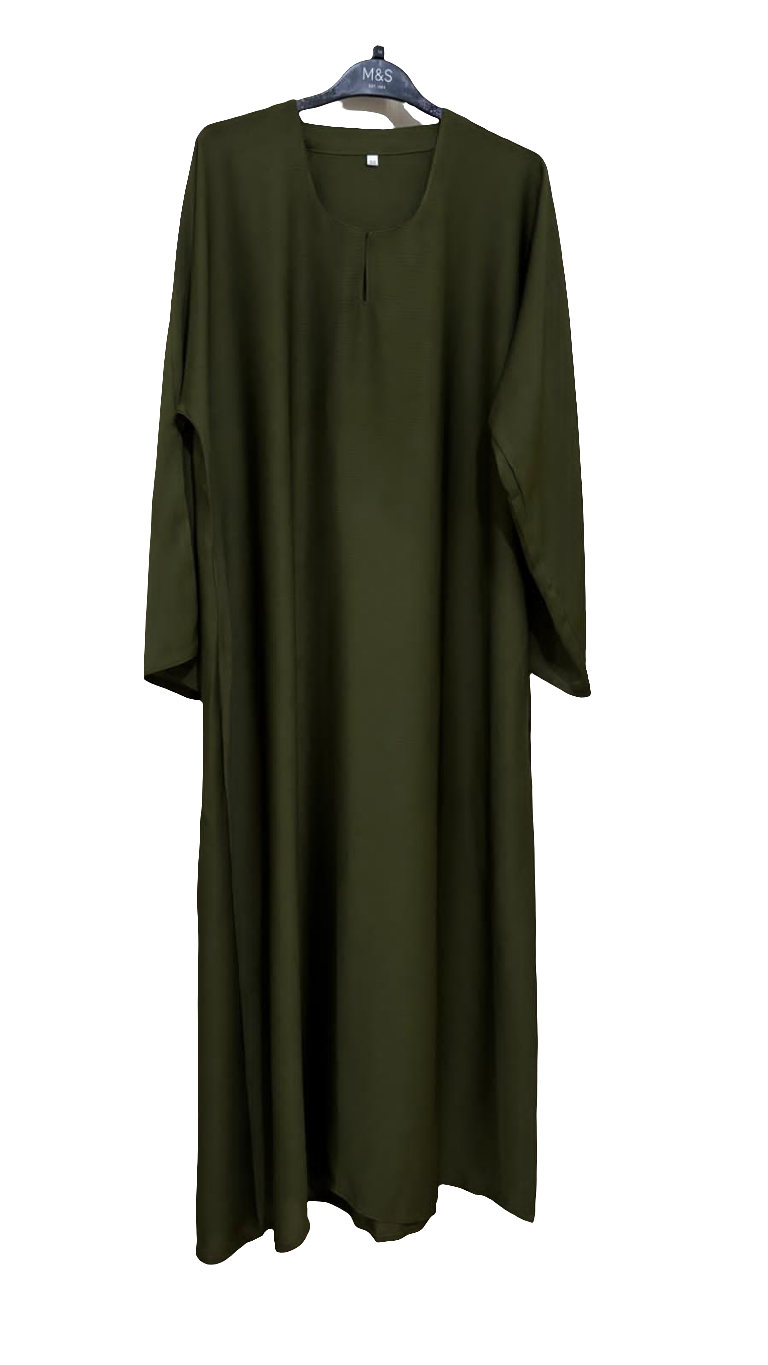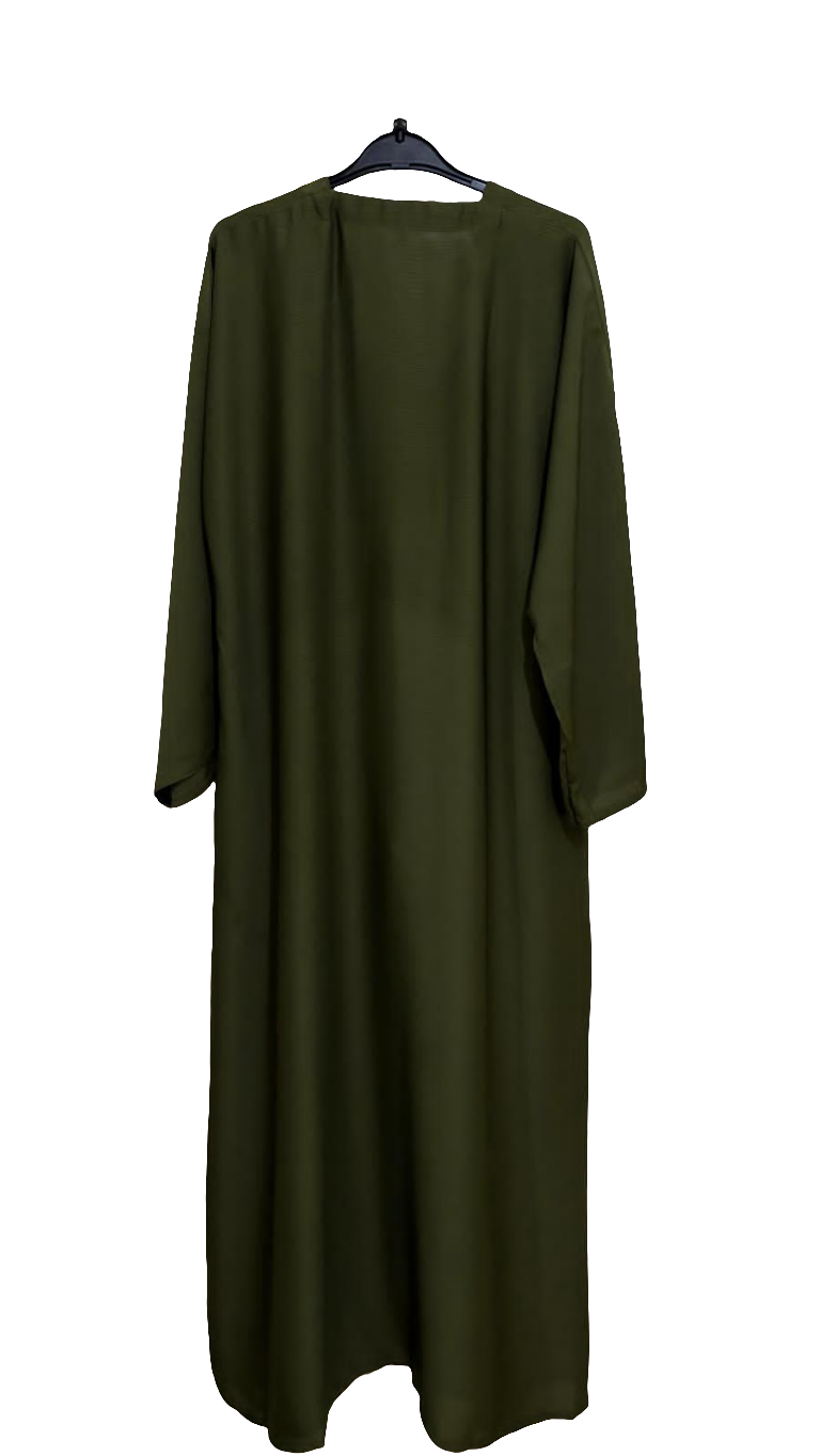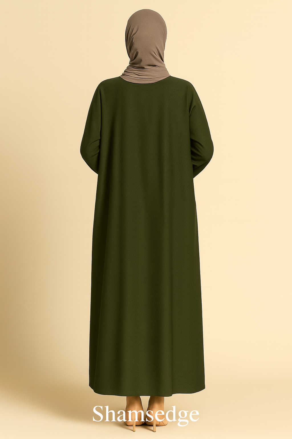 A timeless olive-green abaya crafted from soft, lightweight fabric that flows effortlessly with every step. Its simple, minimalist cut makes it a versatile staple—perfect for casual outings, daily wear, or styling up with accessories for a more refined look. Designed for comfort and elegance in one piece.