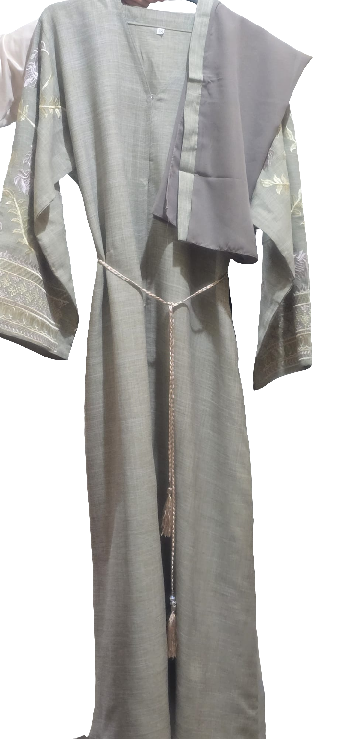 Chic taupe grey abaya crafted from soft textured fabric, highlighted with detailed floral embroidery along the sleeves. The design is complemented by a matching tassel belt and coordinating hijab, offering a complete elegant look. Ideal for both casual wear and special occasions.